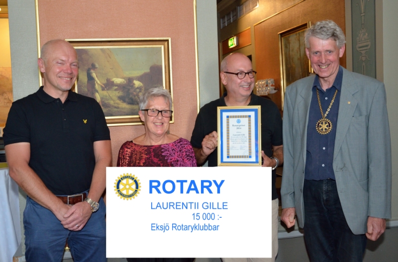 års rotarystipendium: Laurentii Gille Laurentii Gille bildades den 30 oktober anno 1994 och har som mål att öka kunskaperna om Eksjö stads historia samt ge inblick i forna tiders seder och bruk i denna del av Småland. Motivering för 2014 års Rotarystipendium: Laurentti Gille har under sin 20-åriga tillvaro gjort kunskapen om Eksjös historia tillgänglig på ett modernt sätt. |