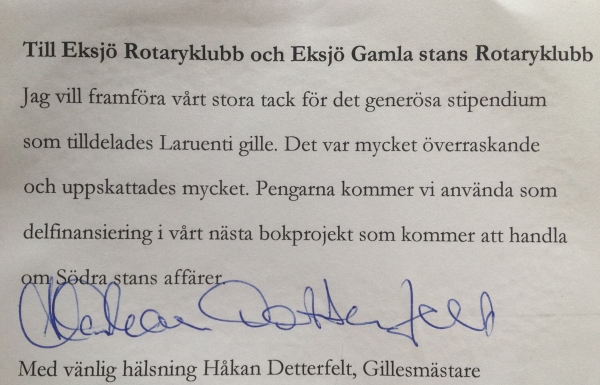 års rotarystipendium: Laurentii Gille Laurentii Gille bildades den 30 oktober anno 1994 och har som mål att öka kunskaperna om Eksjö stads historia samt ge inblick i forna tiders seder och bruk i denna del av Småland. Motivering för 2014 års Rotarystipendium: Laurentti Gille har under sin 20-åriga tillvaro gjort kunskapen om Eksjös historia tillgänglig på ett modernt sätt. |